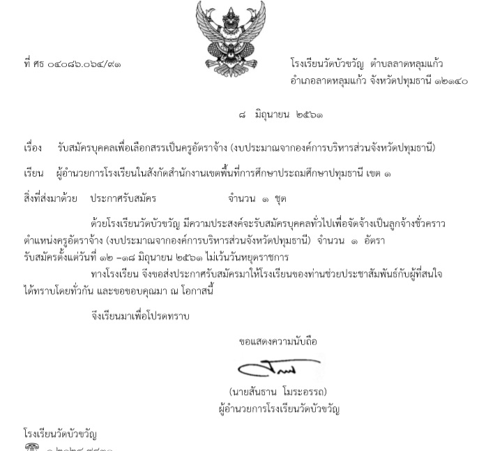 ประกาศรับสมัครครูอัตราจ้าง งบประมาณองค์การบริหารส่วนจังหวัดปทุมธานี